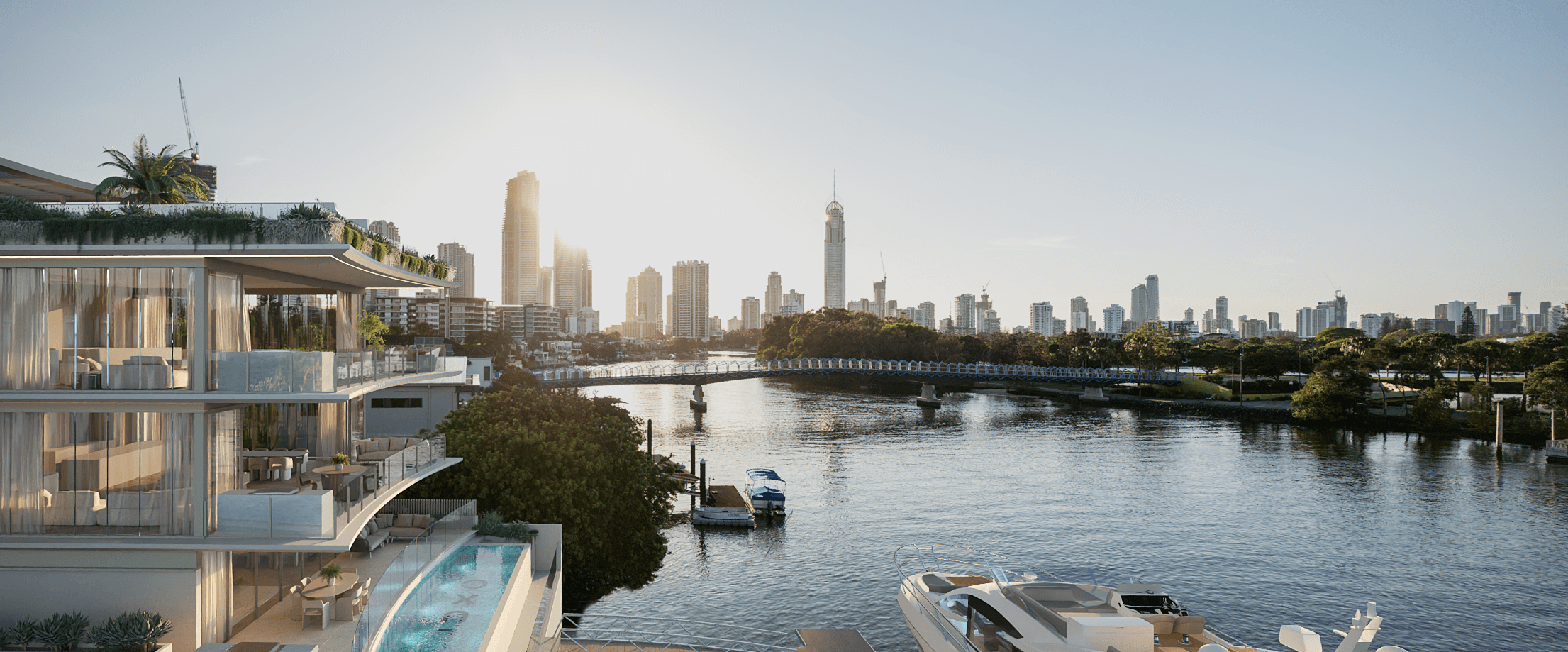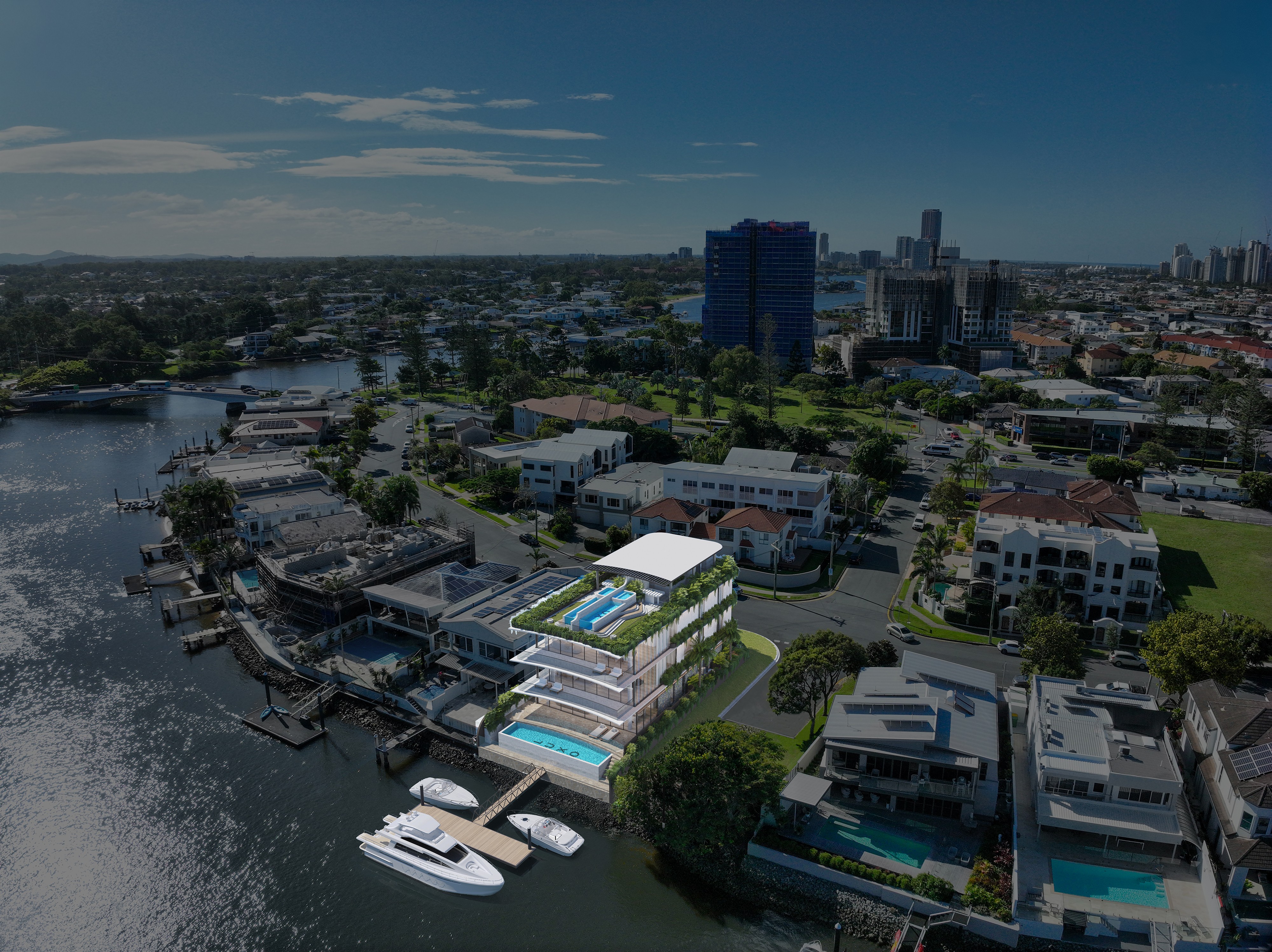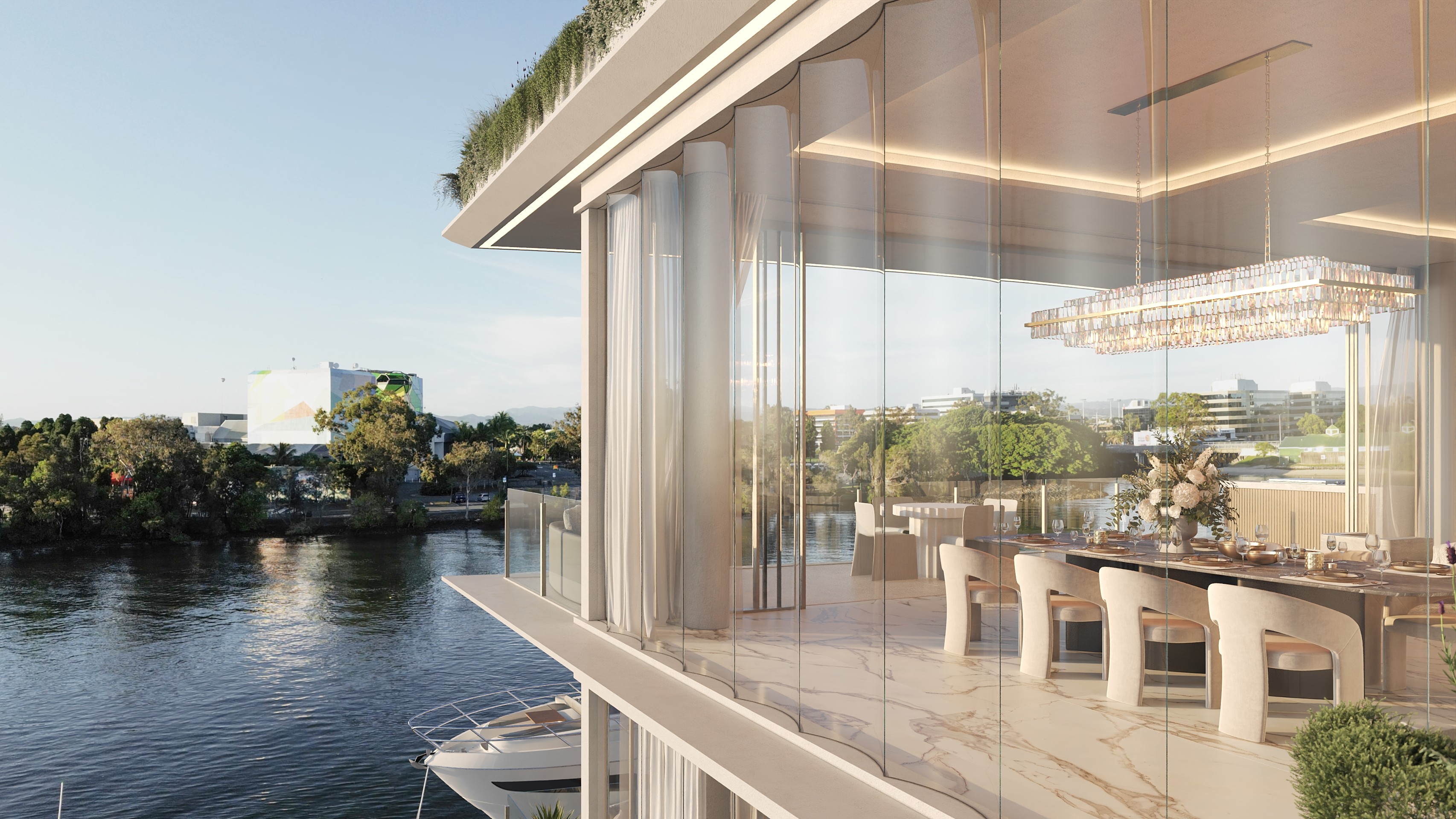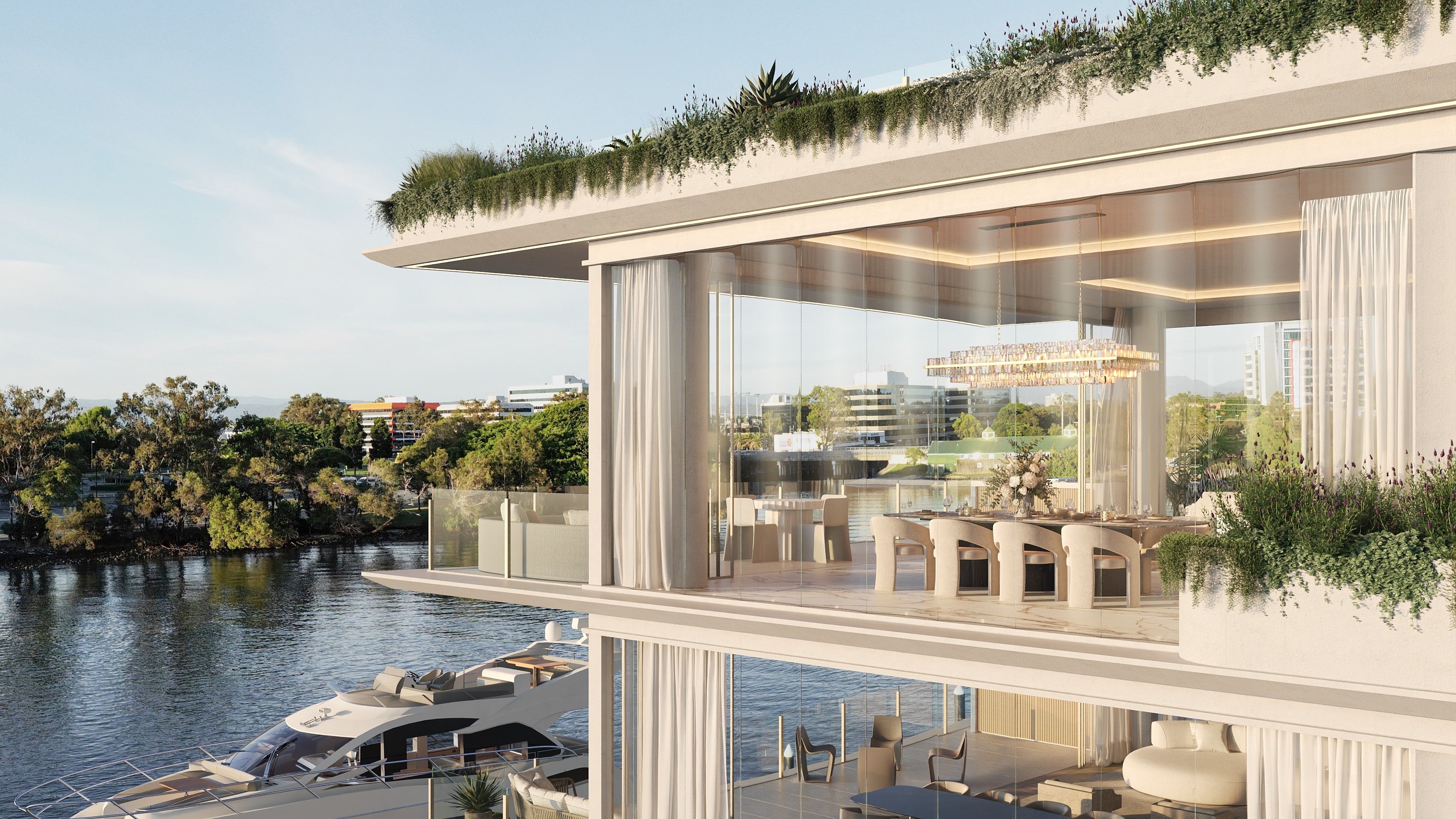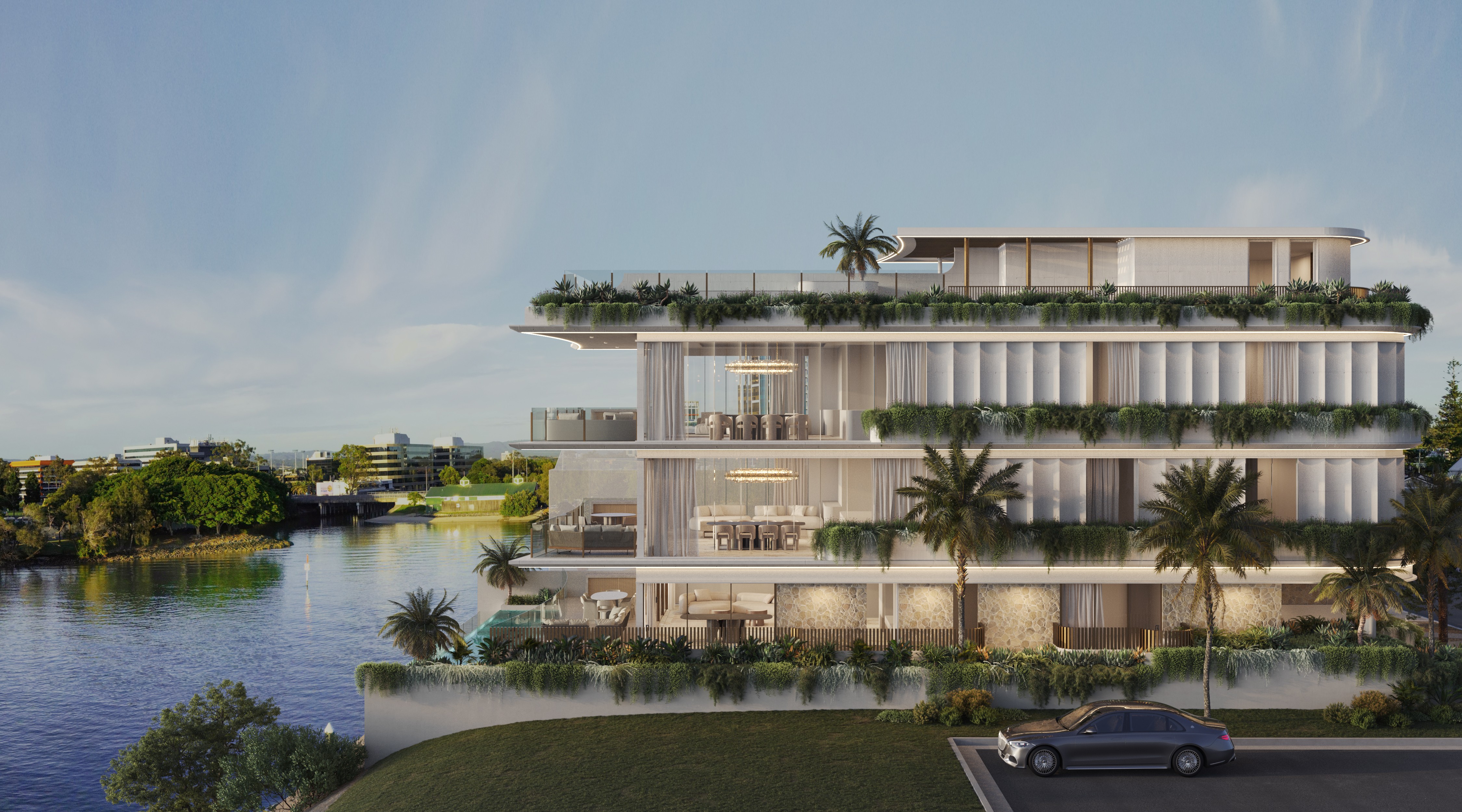 Each 370 sqm,5.5m kitchen island bench tops, 35 sqm outdoor balconies with built-in teppanyaki, expensive “Gaggenau Appliances”, cold-room, mini bar, wine cellar, spa, jacuzzi, private roof terrace bar, yoga, outdoor shower & private pontoon.